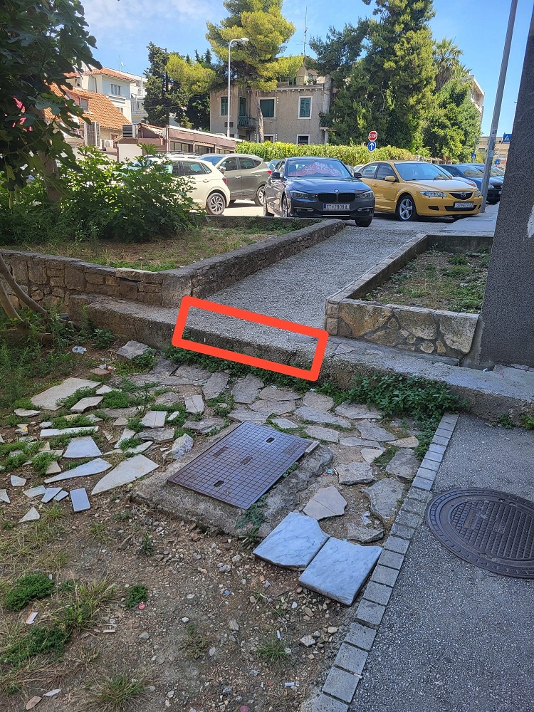 Naime, postojeća stepenica je bila visoka daleko preko standarda (30 cm), pa se s vremenom improviziralo kamenim pločama da bi se nivo podignuo koliko je moguće ali pri svakoj kiši bilo je blata i padova, posebice starijih ljudi.