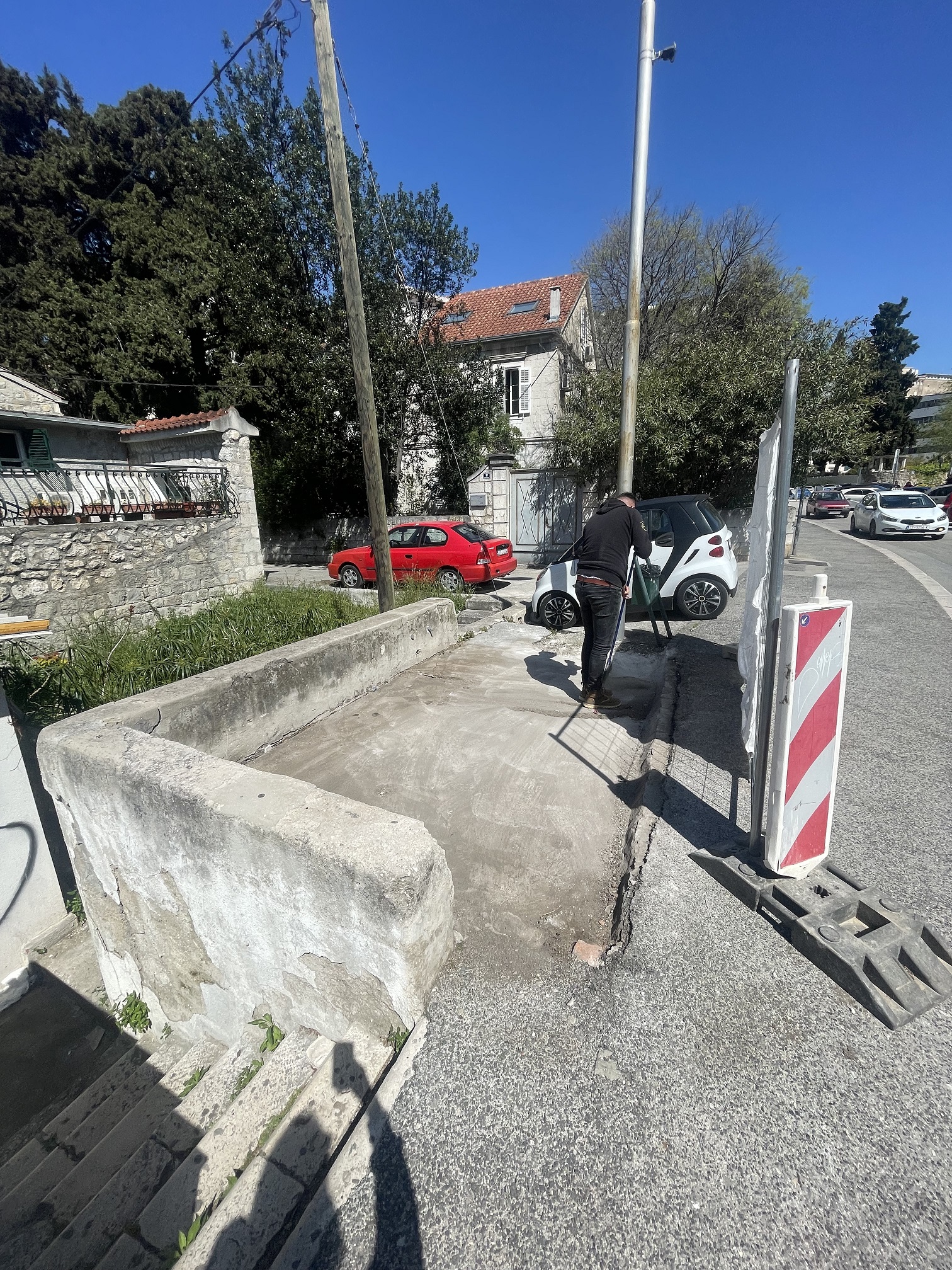 Na lokaciji bivšeg kioska uskoro ćemo postaviti klupe za sjedenje, čime će se to mjesto prenamijeniti iz parkirnog prostora u mali kutak za odmor, uz mogućnost okrijepe hladnom vodom s Prve splitske česme. Također, planiramo urediti postojeći zidić kako bi bio usklađen sa susjednim, koristeći kamene poklopce za ljepši i funkcionalniji izgled.